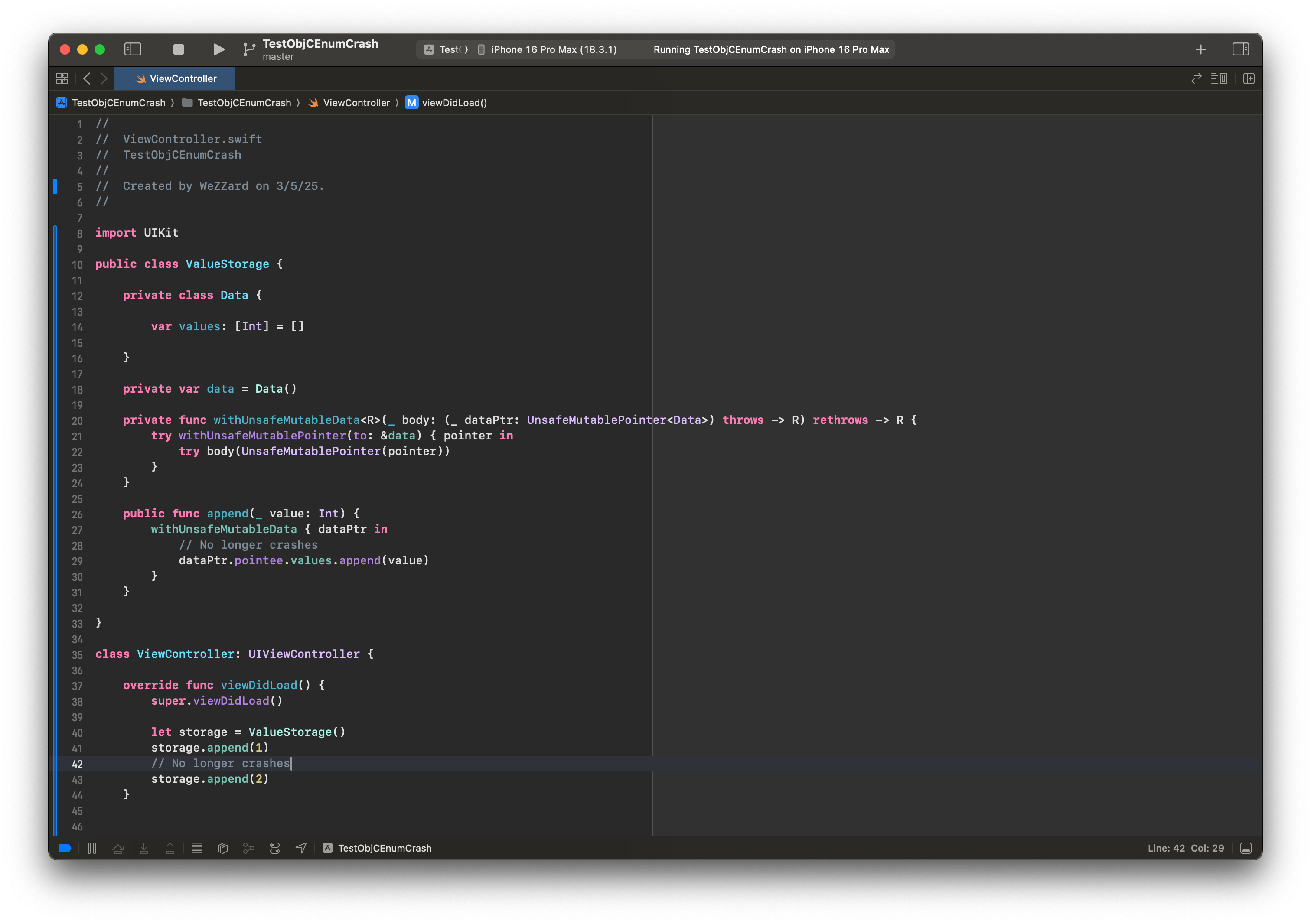 swiftlet storage = ValueStorage()storage.append(1)// 运行时崩溃!storage.append(2)public class ValueStorage {private class Data {var values: [Int] = []}private var data = Data()private func withAutoreleasingUnsafeMutableData<R>(_ body: (_ dataPtr: AutoreleasingUnsafeMutablePointer<Data>) throws -> R) rethrows -> R {try withUnsafeMutablePointer(to: &data) { pointer intry body(AutoreleasingUnsafeMutablePointer(pointer))}}public func append(_ value: Int) {withAutoreleasingUnsafeMutableData { dataPtr in// 立即崩溃的行dataPtr.pointee.values.append(value)}}}